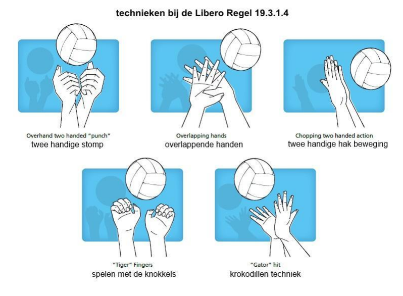 Er zijn technieken waarbij je als libero wel in de voorzone de bal die geheel boven het niet is mag spelen. Zie onderstaande afbeelding.
